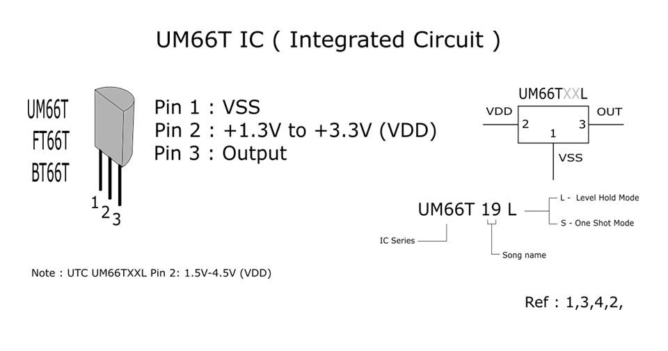 Since the utc um66txxl series include oscillation circuits a. This ic is easy to use because it can work on low. Since the utc um66txxl melody generator ic series include oscillation circuits a compact melody module can be constructed with only a few additional components. It is a three pin ic looks like a transistor. This is a very simple electronics circuit.